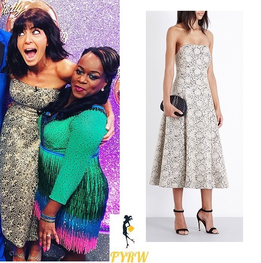 Claudia Winkleman wore a Ted Baker Strapless Embroidered dress in Gold £499 on the Final of Strictly Come Dancing 2016.
