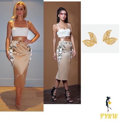 Amanda’s earrings are Nadine Aysoy Petites Feuilles Earring Studs in 18Kt yellow gold / white and fancy yellow diamonds. Price on request.