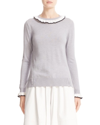 Pair it with this sweater £645 which Adam Lippes created after a trip to Jamaica this season. This soft dove-grey sweater is spun from pure wool to a slim silhouette and trimmed with black and white ruffles at the round neck and cuffs – a nod to the vibrant costumes worn by the island’s Quadrille dancers. Tuck it into clean-cut culottes and complete the look with easy-going slides.