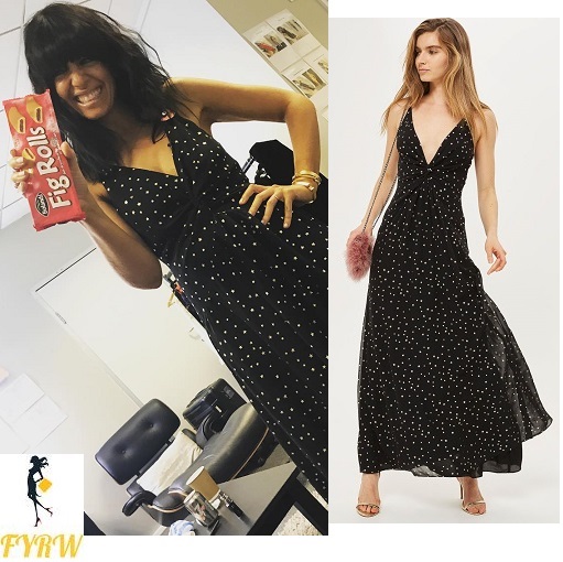Claudia wore a Topshop Star Foil Maxi Dress £55 in Black , for Week 7 of Strictly Come Dancing 2017 on Saturday 4th November 2017.