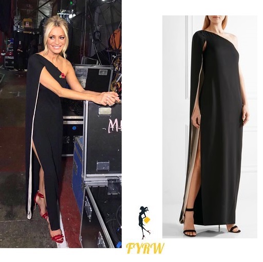 Tess Daly wore a Halston Black Cape Effect One Shoulder Gown £500, for the Week 8 Results Show of Strictly Come Dancing on Sunday 12th November 2017. Tess wore another Halston cape dress last year.
