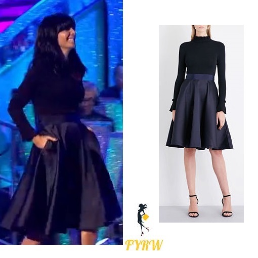 Claudia wore a Ted Baker Zadi Frill Cuff Dress in Navy £199, for the Week 8 Results Show of Strictly Come Dancing 2017 on Sunday 12th November 2017.