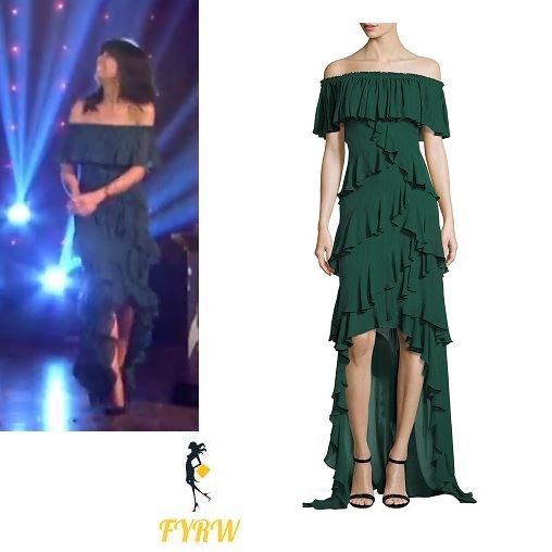 Claudia wore a Badgley Mischka Off-the-Shoulder Ruffled High-Low Gown £479 in Dark Emerald , for Week 9 of Strictly Come Dancing 2017 on Saturday 18th November 2017.