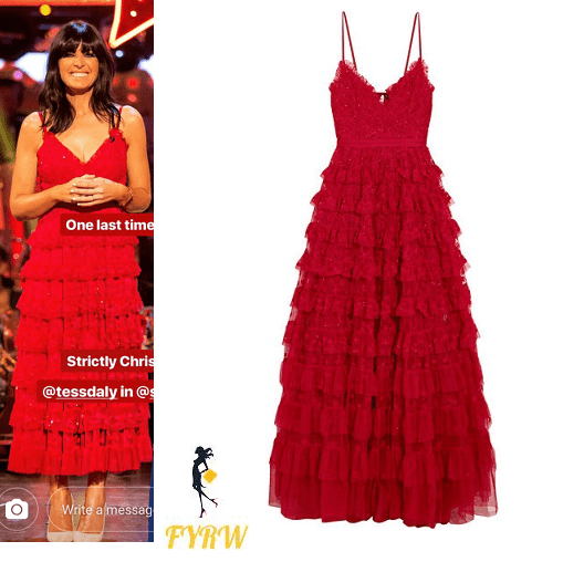 Claudia wore a Needle & Thread – Marie Tiered Embellished Tulle Gown in Red £986, for the Strictly Come Dancing Christmas Special 2017 on Monday 25th December 2017.
