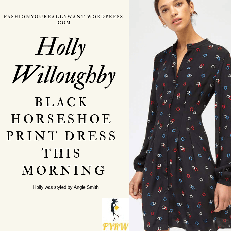 Holly wore a Warehouse Horseshoe Print Shirt Dress £18 in Black, for This Morning on Tuesday 2nd April 2019. Holly was styled by Angie Smith.