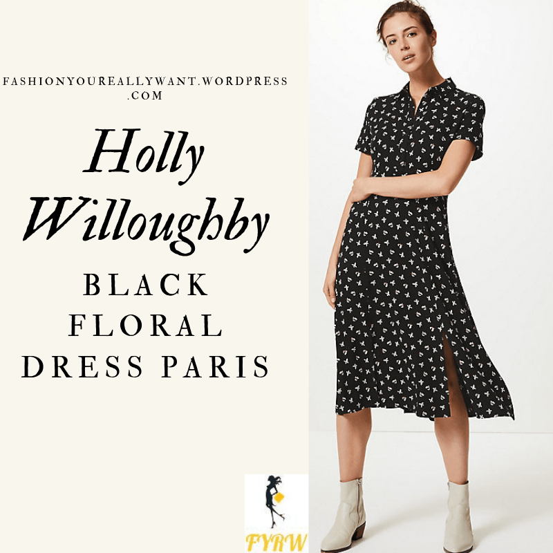 Holly wore an M&S Collection Floral Print shirt Midi Dress £39.50 in Black Mix, in her photo at the Eiffel Tower, Paris on Sunday 30th June 2019.