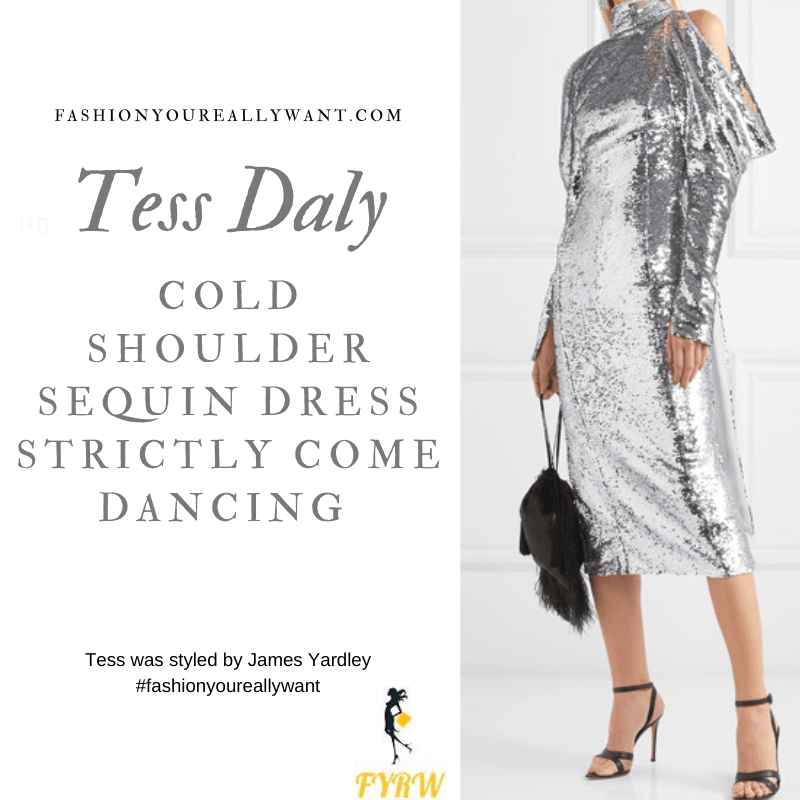 Tess wore a 16ARLINGTON Cold-shoulder sequined tulle turtleneck midi dress £193 in Silver (sold out), for the BBC Strictly Come Dancing Christmas Special on Wednesday 25th December 2019. Tess was styled by James Yardley. It looks like the sleeves and hem have been altered for Tess/