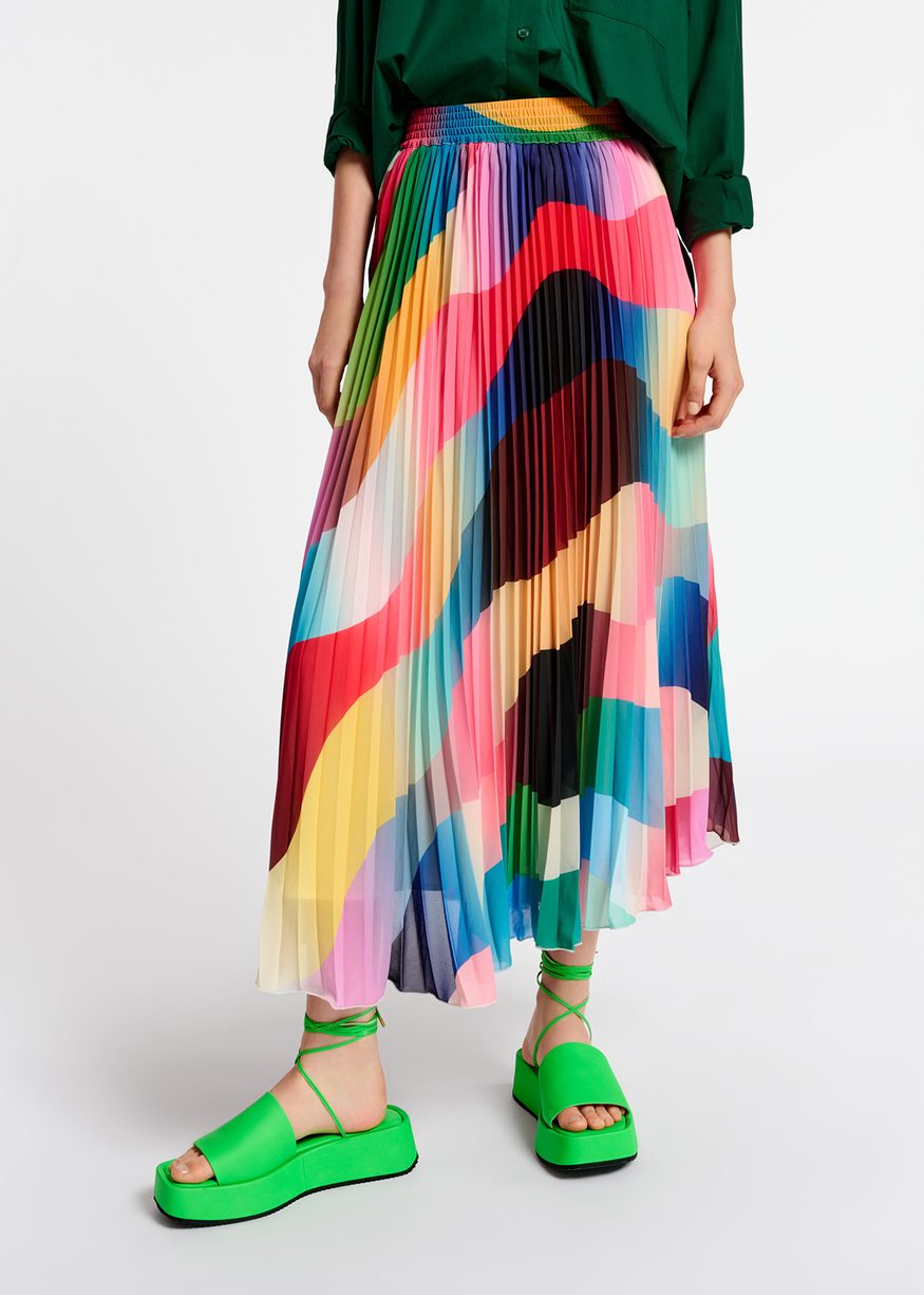 Cut from a lightweight recycled polyester featuring an eye-catching graphic print, this midi-length skirt is pleated to create movement with every step. The A-line silhouette sits comfortably at the slimmest point of your frame thanks to the elasticated waistband.