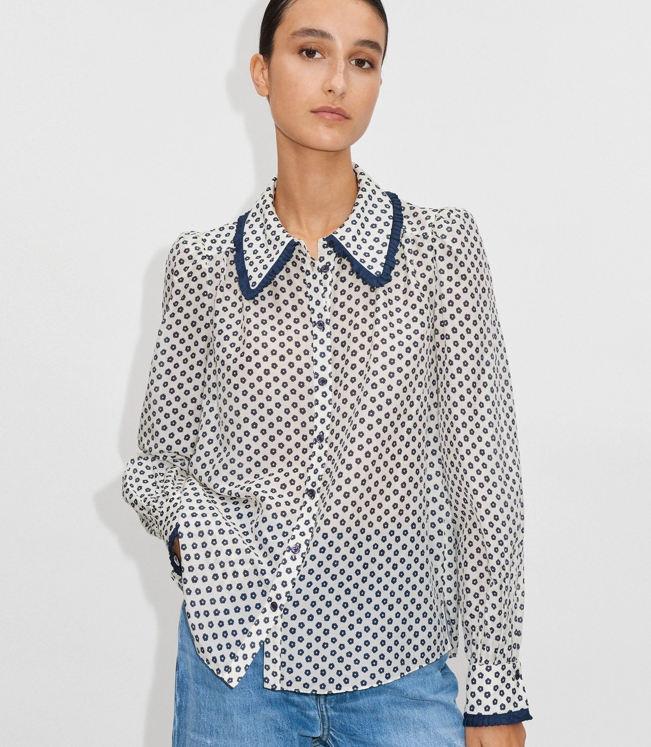 At first, the pattern covering this blouse might look like a classic polka dot one, but when you take a closer look you’ll see each spot is actually a small flower. One of our bespoke prints, it covers the lustrous blend of silk and cotton defining the style and is joined by pleated trims.