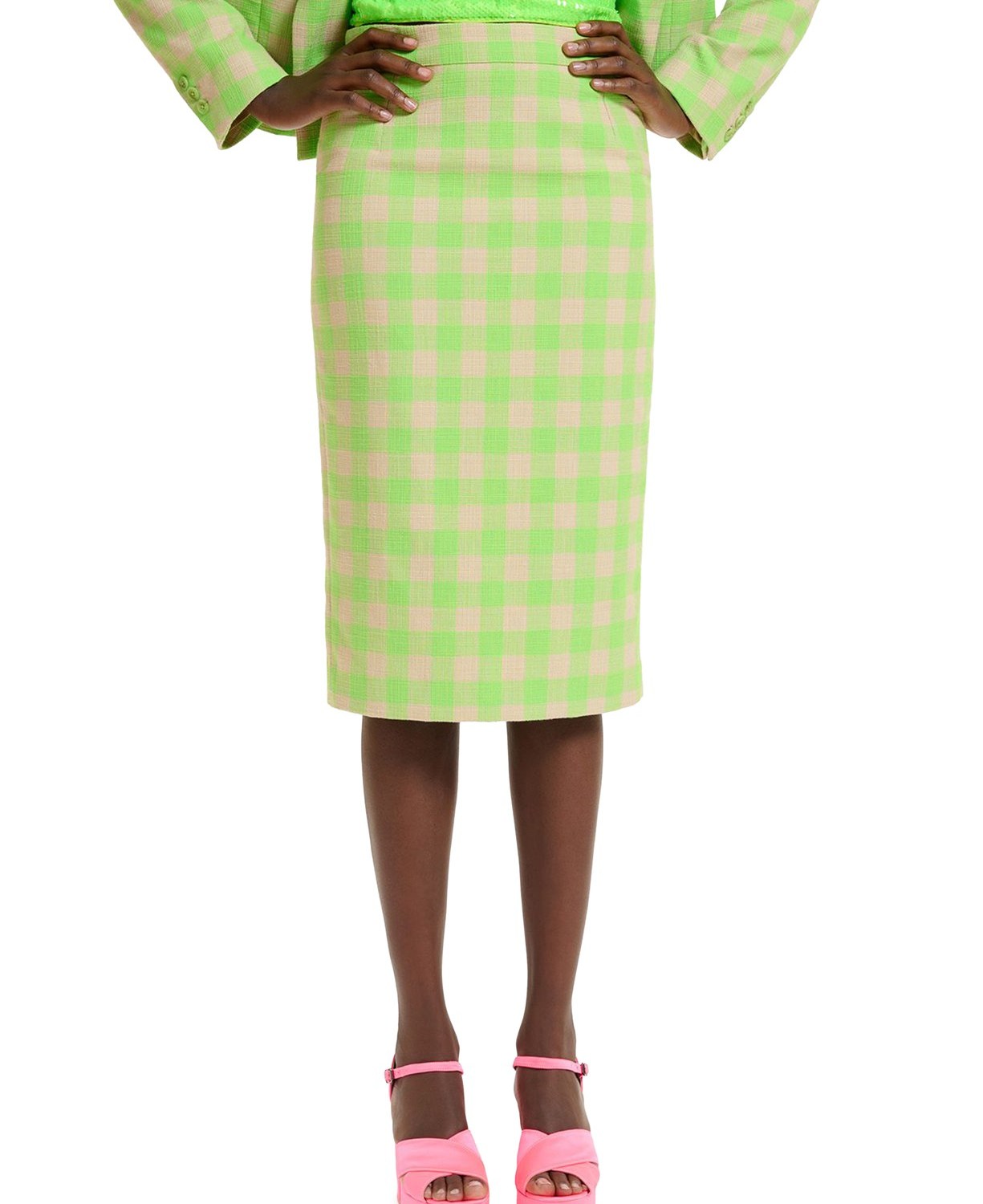 Straight skirt, midi length, lined, check pattern, zipper closure, high-waisted fit.