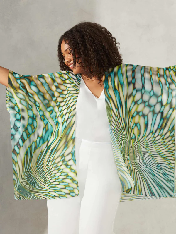 Alison wore a Live Unlimited Green Kaleidoscope Print Short Kimono £59, for This Morning on Wednesday 24th May 2023. Alison was styled by David O’Brien.