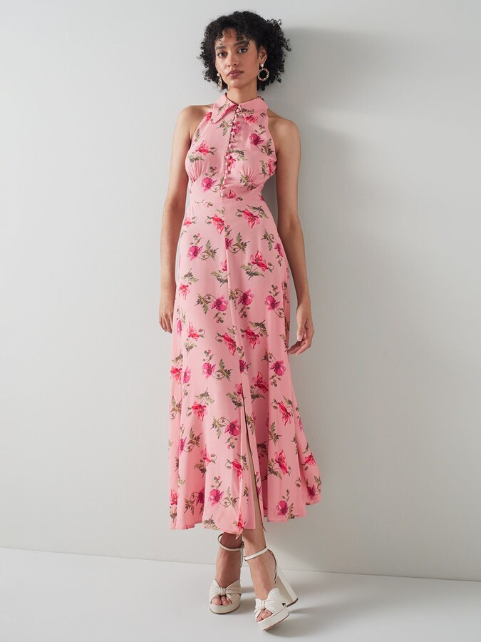 Tapping into our love for the Seventies, the Flori dress is long in length and luscious in print. Crafted from pink silk with a vibrant poppy print, it has a sexy cutaway neckline with a long rounded collar, covered buttons, pleating to the bust and back, a nipped waist and a floaty long skirt with central slit. Go the whole hog and wear it with platforms for a fun Studio 54 feel.