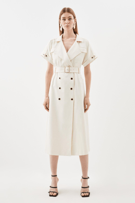 Imbued with our signature military elegance, this midi dress has a sharply-constructed silhouette that will elevate your professional and evening edits. This silhouette has exaggerated notched lapels to the short-sleeved bodice, offset by a form-defining belt and double-breasted placket.