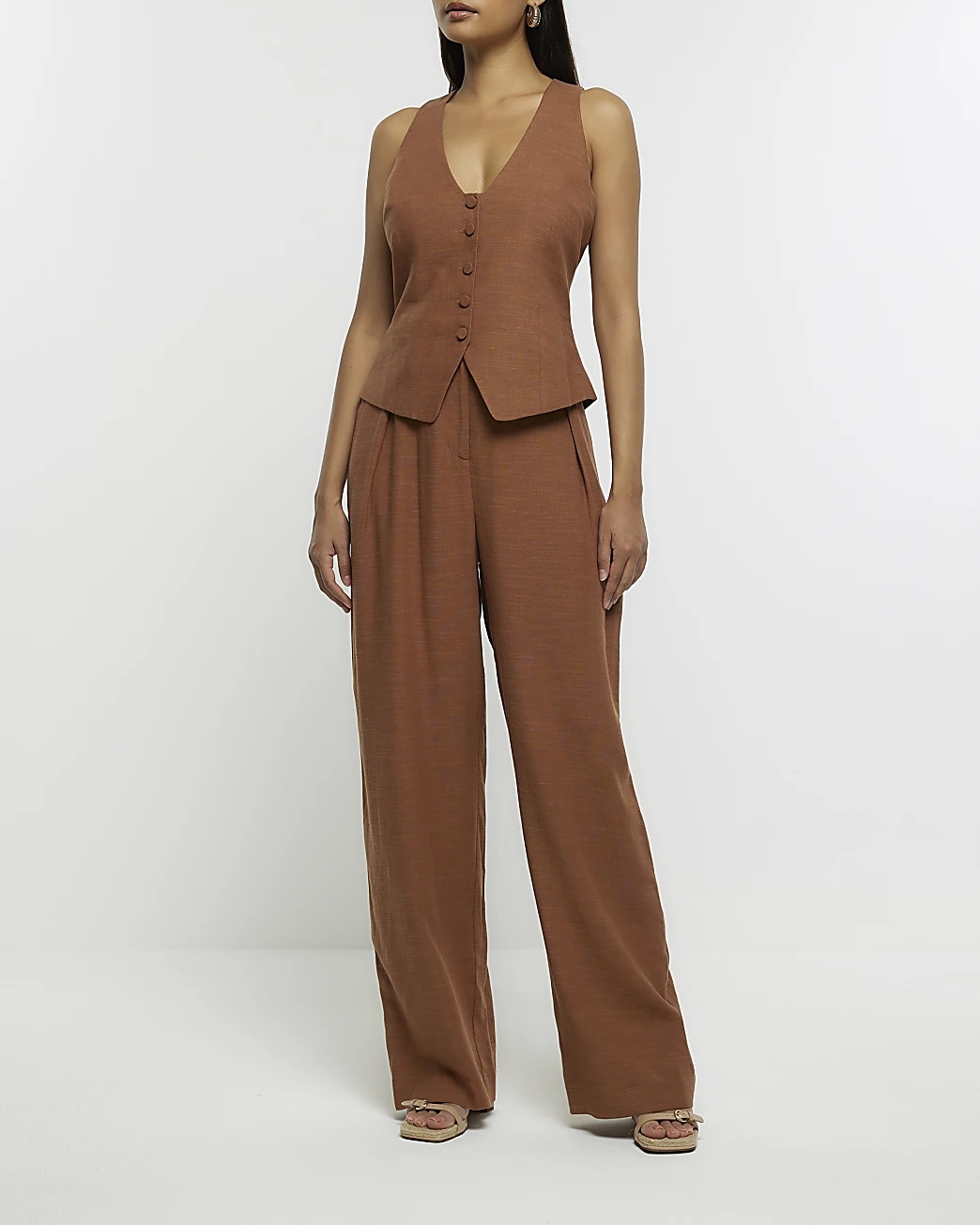 Rochelle’s trousers are the matching River Island Brown Wide Leg Trousers With Linen Blend £40. High waisted. With linen blend. Wide leg. Belt loops.