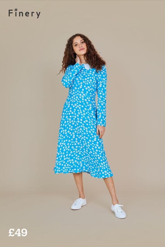 Our Piper midi in a blue and white daisy ditsy print, is a spring dress you will reach for every year. Made from viscose this dress features long straight sleeves and a rounded neckline with and on-trend contract collar. A waist seam pulls you in at the right place for a flattering fit above a full and flowing skirt.