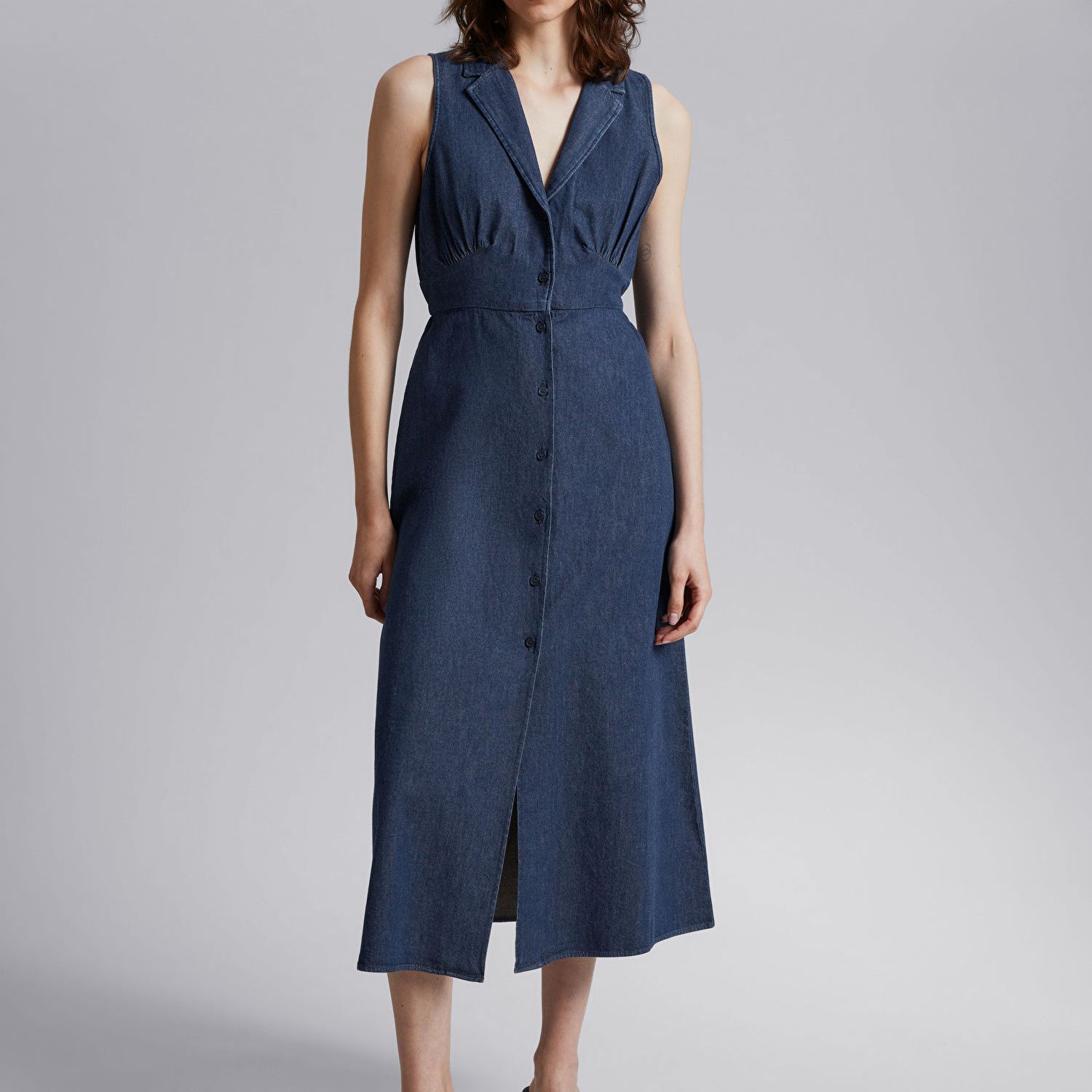 Collared midi shirt dress. Designed with a figure-hugging silhouette, this dress features a notched lapel collar with a deep v-cut neckline, a shirred bust with a front buttoned placket and soft ties at the back.