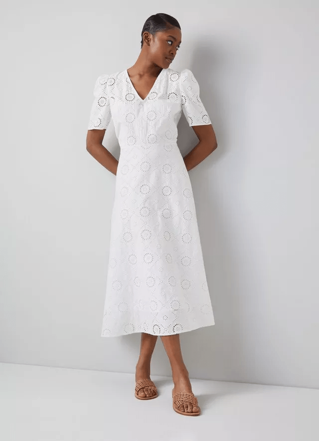 Holly wore an LK Bennett Jane White Cotton Broderie Anglaise Dress £329, for This Morning on Thursday 7th September 2023. Holly was styled by Danielle Whiteman. Also available from LK Bennett.