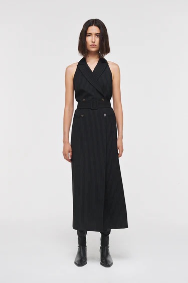 Bring power dressing into your everyday wardrobe with statement pieces. A new take on the classic pinstripe, Kendra is a refined double-breasted dress with horn buttons and a belt to cinch the waist. Wear on its own or pair with your favourite turtleneck for an effortless look.