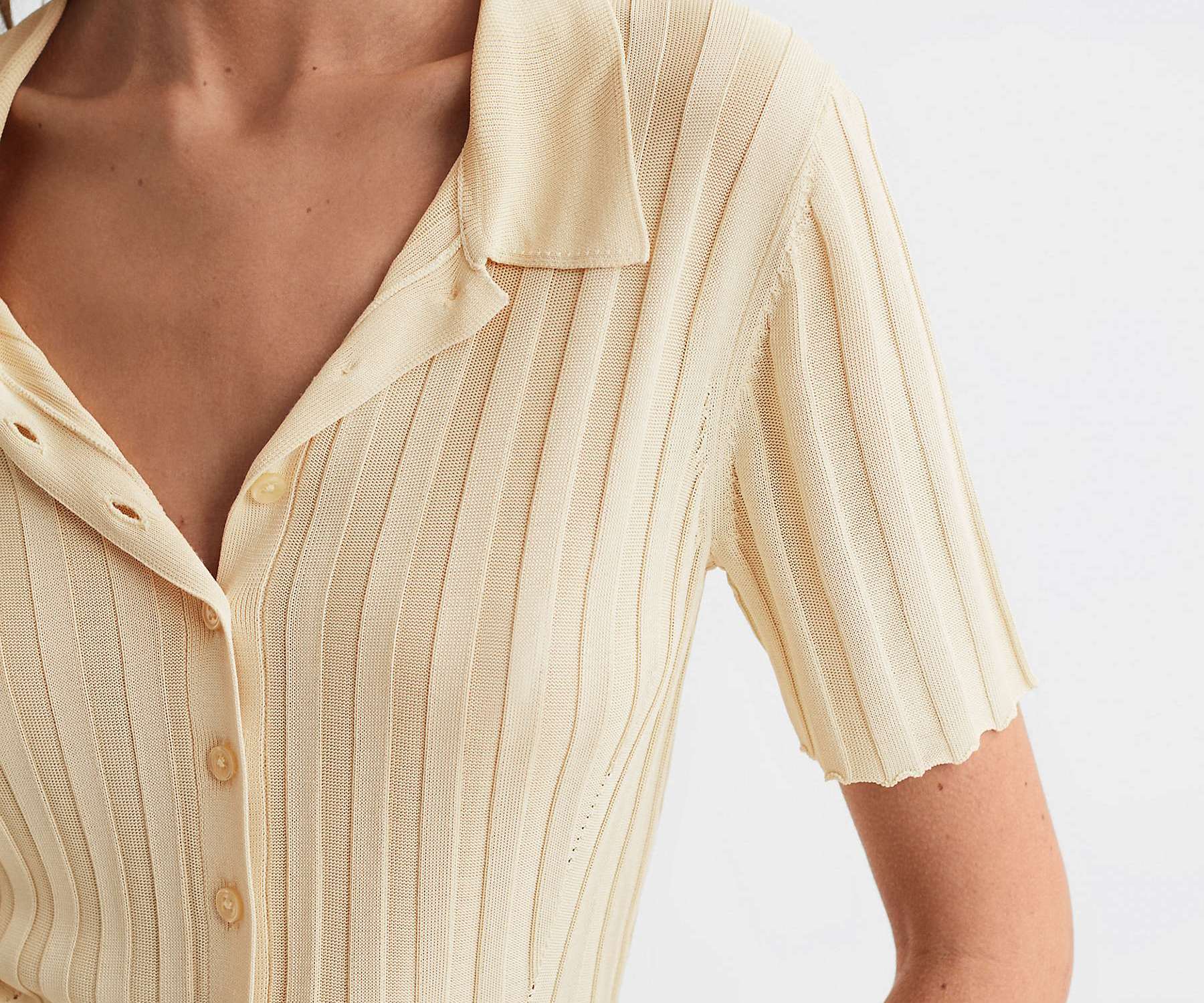 Josie wore a Reiss Stella Fitted Rib Knit Short Sleeve Shirt in Lemon £128, for This Morning on Thursday 14th September 2023. Josie was styled by Rachael Hughes.