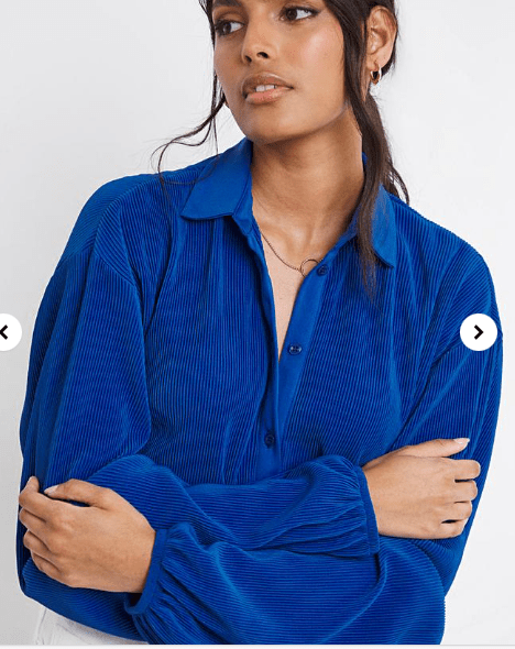 Alison wore a JD Williams Blue Long Sleeve Plissé Shirt £21, for This Morning on Friday 29th September 2023. Alison was styled by David O’Brien.