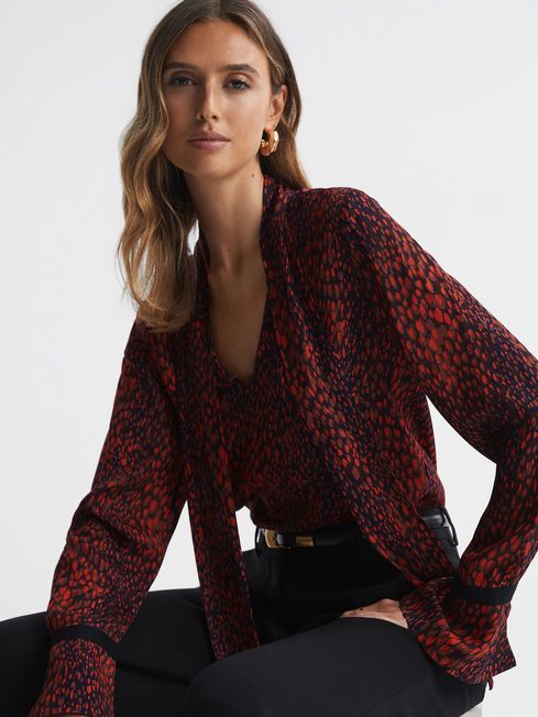 A VIBRANT, RED ANIMAL PRINT FEATURES TO THE PHILLIPA BLOUSE, MAKING IT A STAND-OUT PICK FOR BOTH YOUR OFFICE AND SPECIAL OCCASION EDITS. IT’S CUT WITH A V-NECKLINE AND A SELF-TIE ELEMENT, ALLOWING A CUSTOMISABLE WEAR. LONG SLEEVES FLARE AT THE CUFFS FOR A MORE DYNAMIC SILHOUETTE. OPT FOR BLACK SEPARATES TO COMPLEMENT THE EDIT.