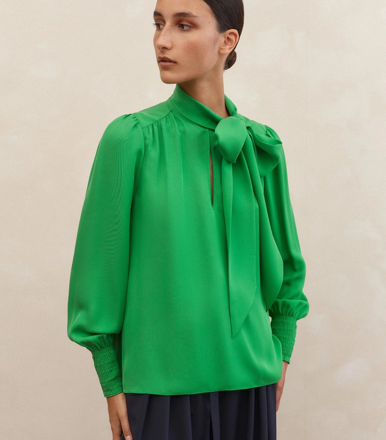 This silk blouse’s combination of a bold colour and lightweight fabric answer your wardrobe’s occasionwear and office needs in one step, complementing tucked-in styling without creating bulk.