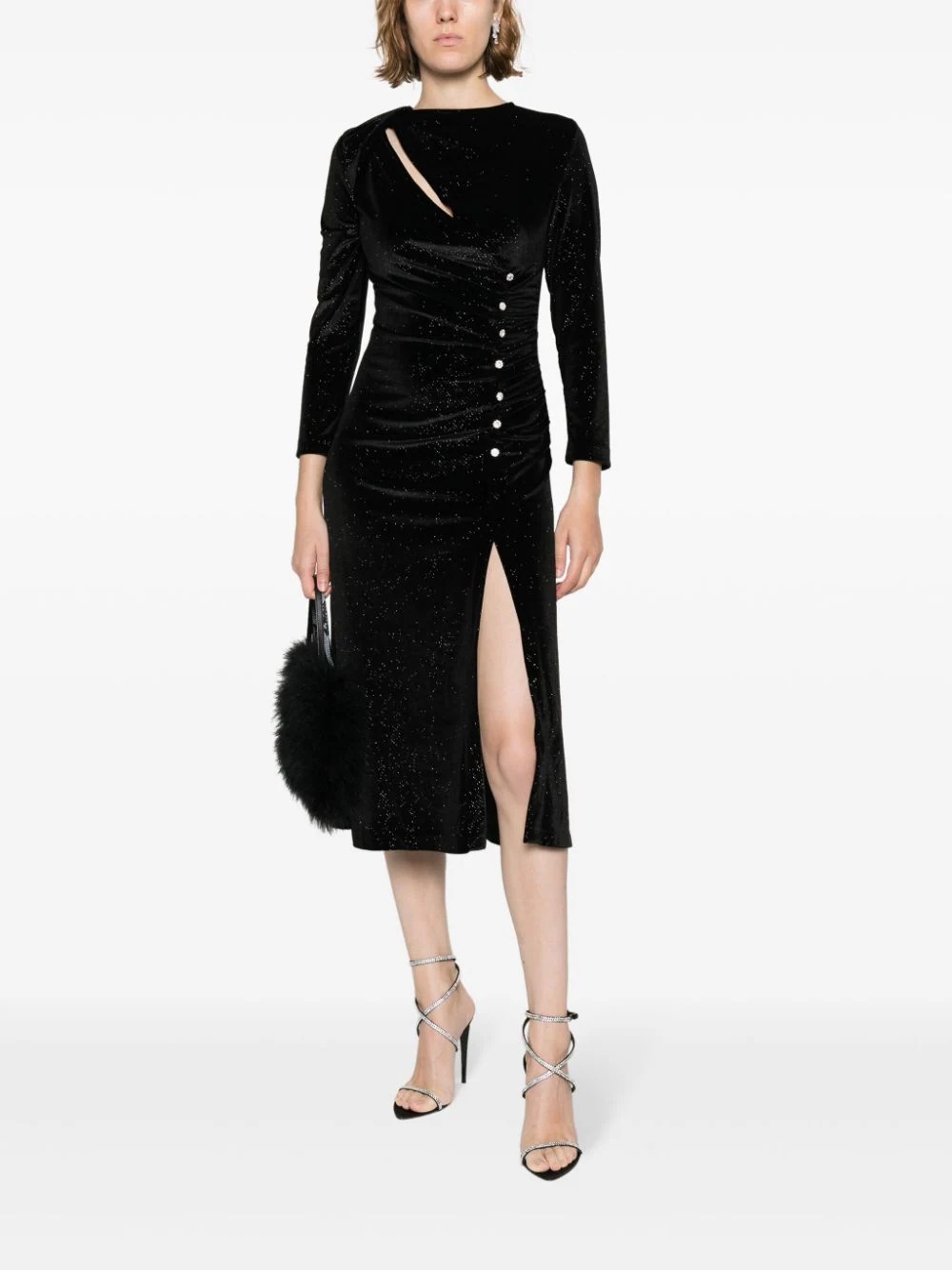 Sequinned velvet midi dress with draped effect, featuring a round neck with a slit, long sleeves, a side slit and embellished with jewellery buttons on the side.