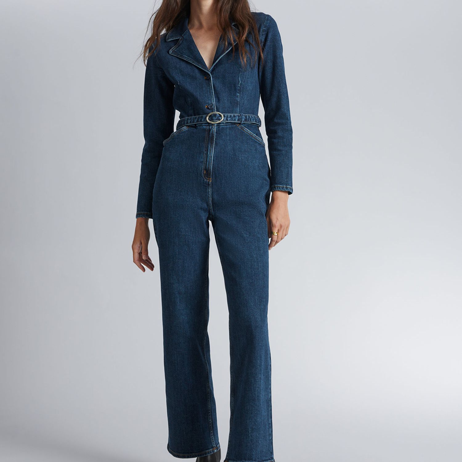 Collared jumpsuit secured with a tonal buckle belt.– Fitted, straight silhouette– Button closures at the front– Duo pockets.