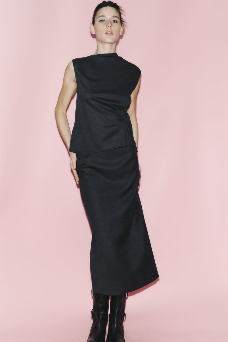 Rochelle’s skirt is a Zara ZW Collection Wool Blend Pencil Skirt £59.99 in Anthracite Grey. High-waist midi skirt made of a spun wool blend. Featuring a back slit at the hem and invisible zip fastening.