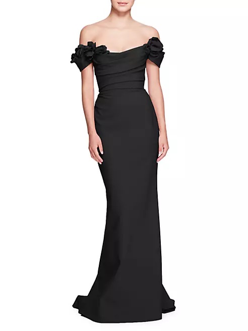 Old-Hollywood inspired gown with a dramatic shoulder-baring neckline and romantic rosette detailing at the shoulder.