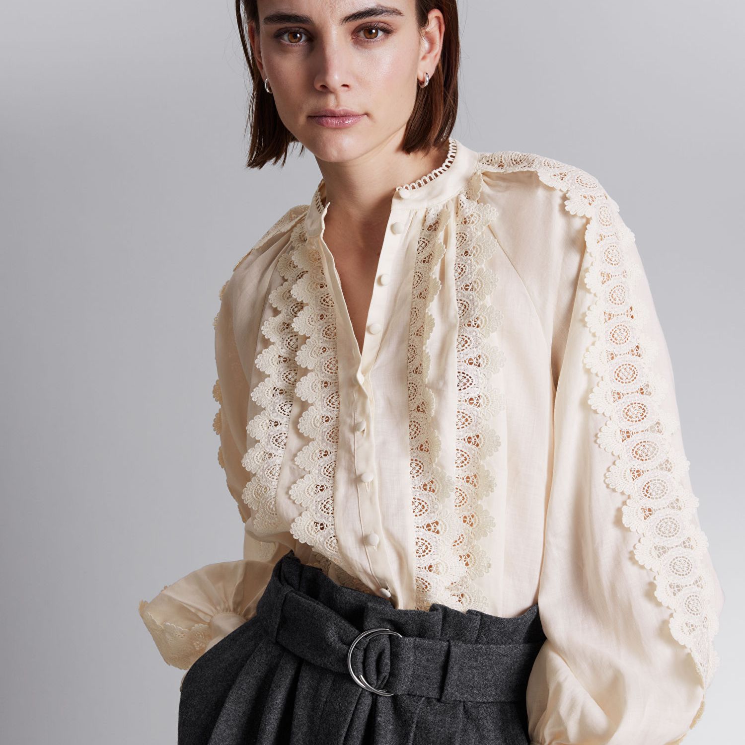 Buttoned A-line blouse traced with scalloped lace along the sleeves and placket. • Scalloped stand-up collar• Raglan sleeves• 12 button closures• Scalloped, buttoned cuffs.