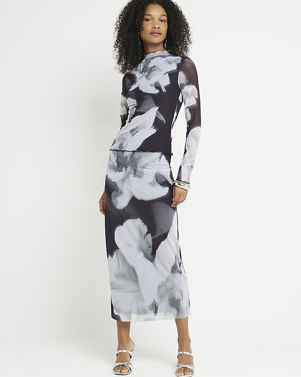 Josie’s skirt is the matching River Island Black Floral Mesh Maxi Skirt £30.