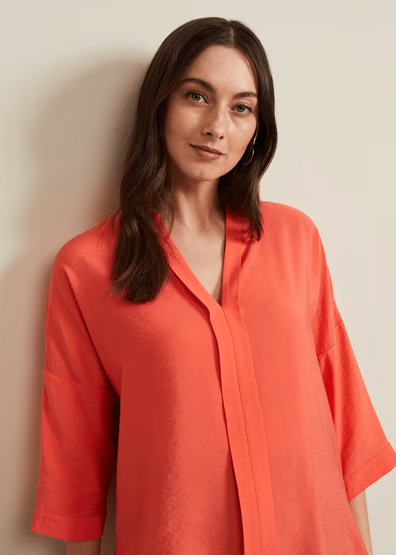 Cut in a relaxed fit, our longline Cynthia shirt is designed in a statement coral shade with a V-neckline, pleated yoke and oversized 3/4 length sleeves. Pair with jeans for an easy everyday look.