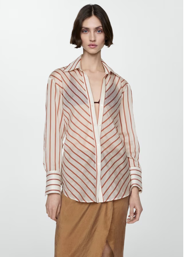 Cotton and lyocell blend fabric. Straight design. Semi-transparent design. Striped print. Shirt-style collar. Long sleeve with buttoned cuffs. Front button closure. Decorative bow on the back.
