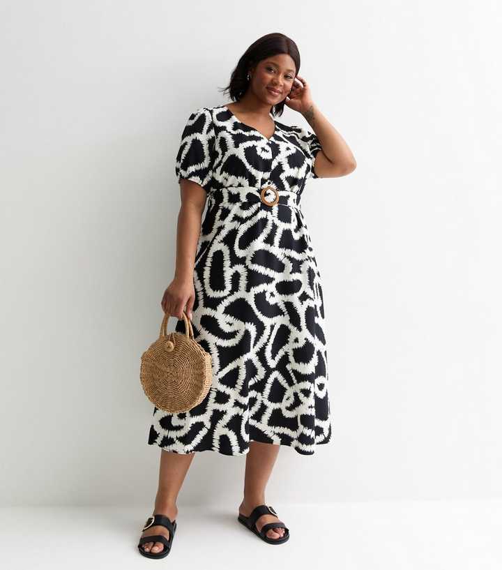 Curves. Perfect for sunny days and balmy evenings, opt for this black midi dress with its chic detachable belt and statement all-over print.