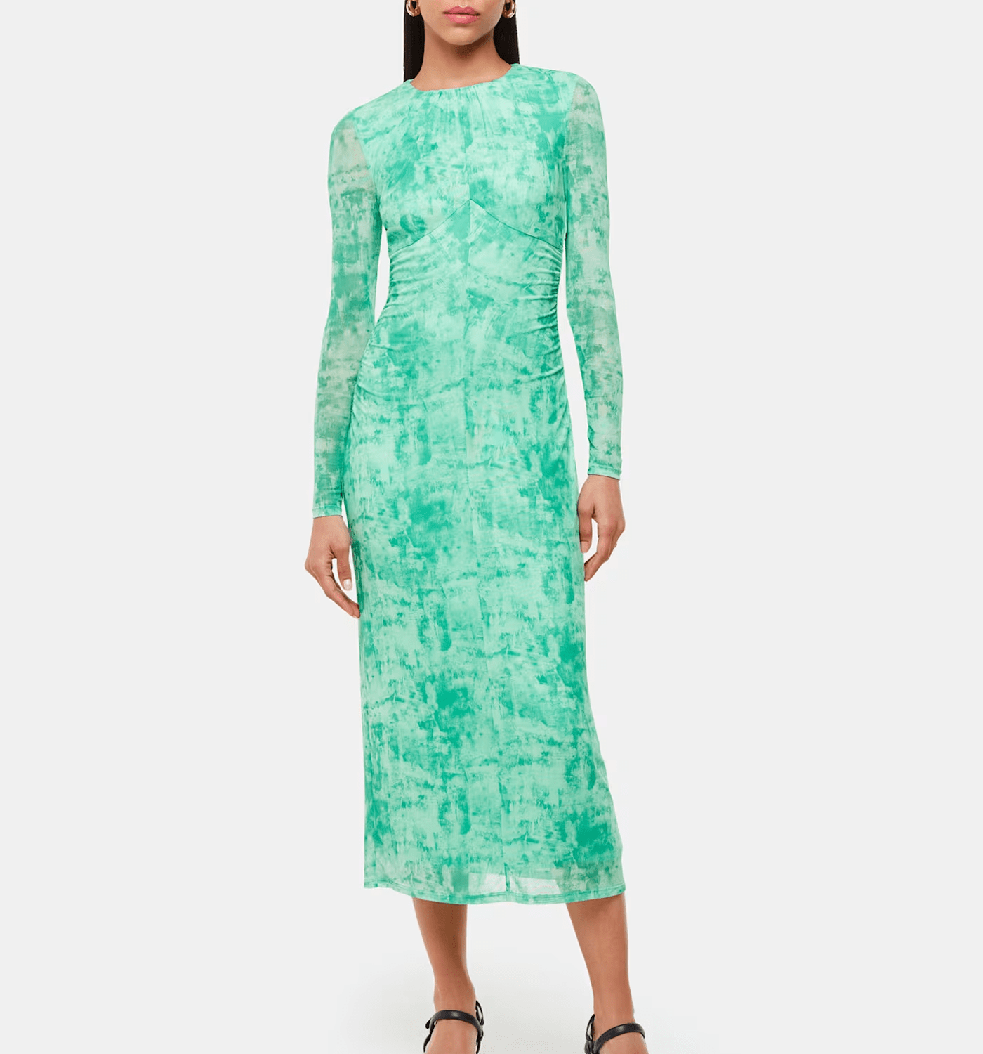 Elevate your style for any occasion with our Brushwork Print Mesh Dress, designed to set you apart from the rest. It comes in a green shade in a bodycon fit and has a unique brushwork print to draw focus. Complete with ruched detailing around the waist, this dress will give you the most timeless silhouette.