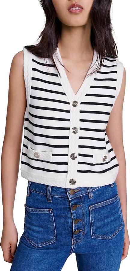 Inspired by waistcoats, this short sleeveless jumper features an interplay of knitted stripes and twisted edges. Featuring a V-neck, two welt pockets, and gold buttons to add a touch of sparkle to your seasonal silhouette.