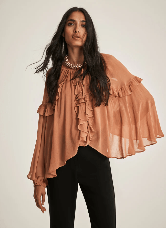 Rust tone blouse with an open V-neckline, ruffle detailing, long sleeves, cape overlay with a ruffle tie fastening through the front.