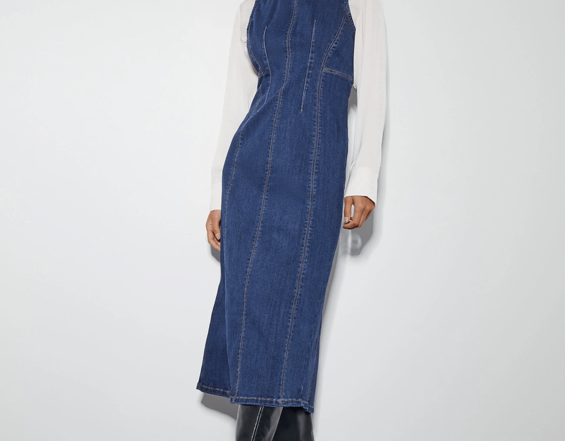 Jean-ius transitional piece. Perfect for showing off throughout the seasons, this denim dress is a timeless number you can love and wear forever. Boasting a structured, sleeveless silhouette that falls to a midi length, style on its own or layer with crisp cotton shirts.