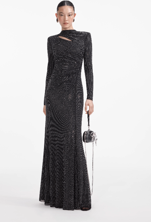 Cut from rhinestone-studded mesh, this floor-sweeping dress pairs its high-shine feel with a sleek silhouette, and an edgy cut-out to match. Show off its elegant neckline with statement earrings.