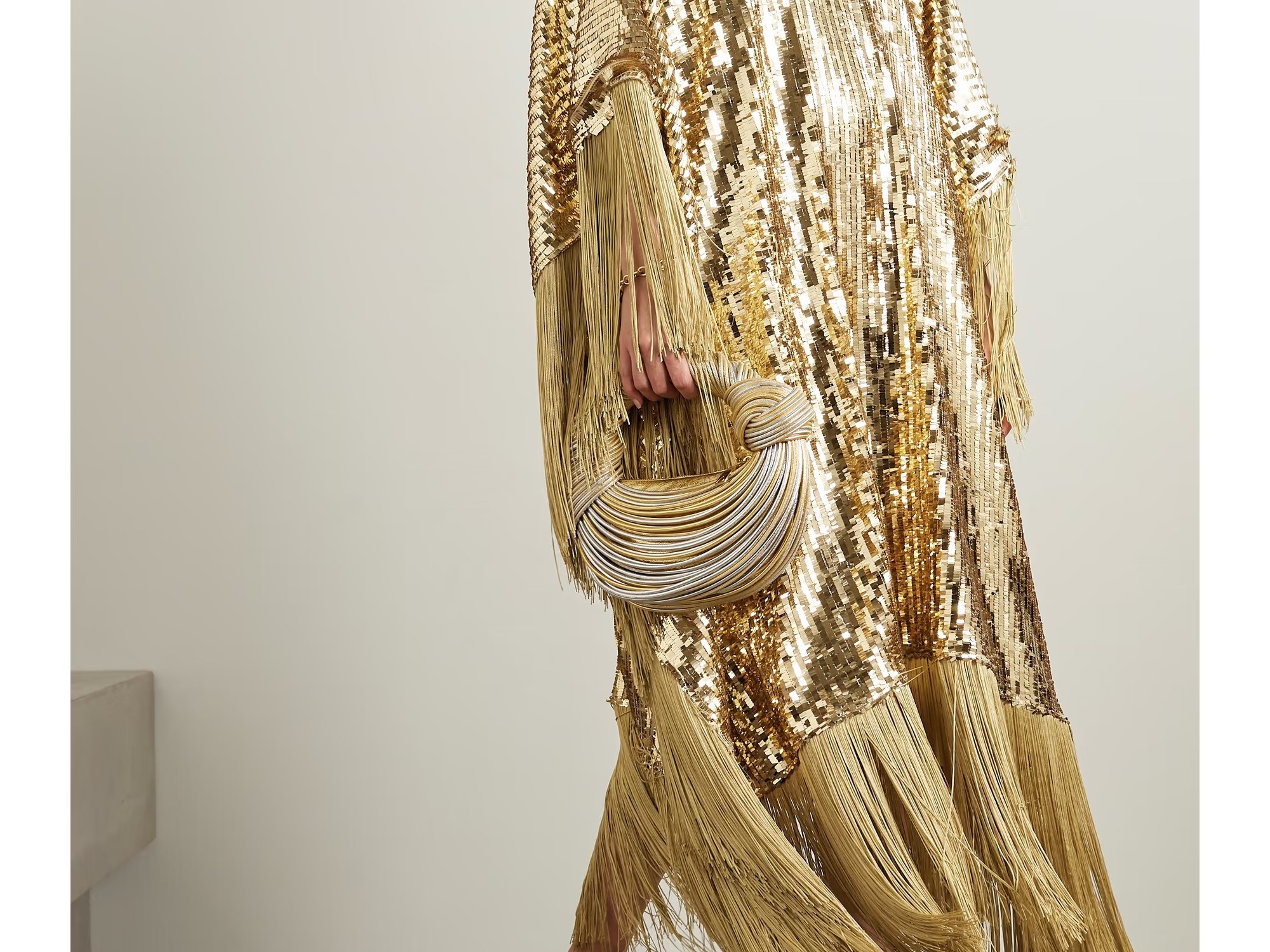 EXCLUSIVE AT NET-A-PORTER. Taller Marmo’s ‘Mrs. Ross’ kaftan is inspired by gowns worn by the glamorous diva herself, Diana. Cut from tulle that’s saturated with shimmering sequins, this ‘Disco’ version has a satin tie-detailed high neck, wide sleeves and a waterfall hem traced with a sweeping fringe.
