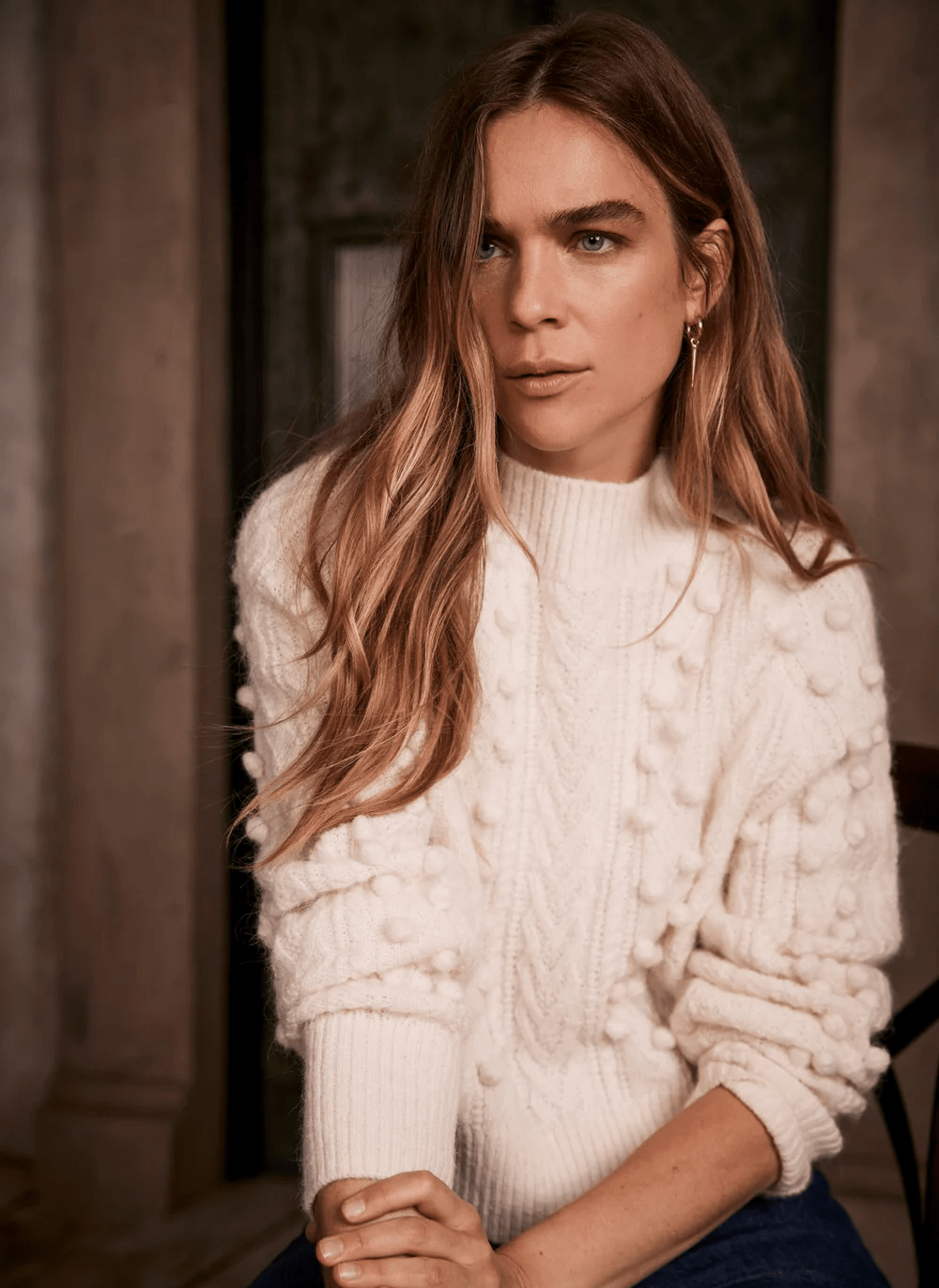 Cream cable jumper with a high neckline, long sleeves and bobble detailing.