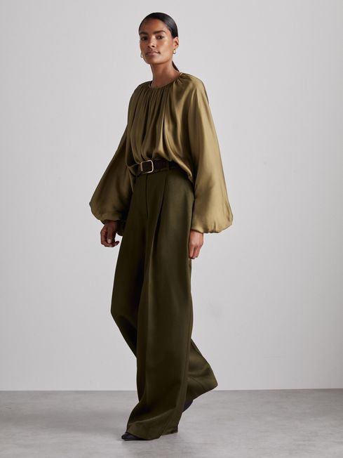 The Finley top is crafted to a billowing proportion that’s gathered into the classic round neckline and grown-on sleeve cuffs — note the swaying ties. It’s crafted from light-catching satin with a fluid drape, then accented with a keyhole at the nape.