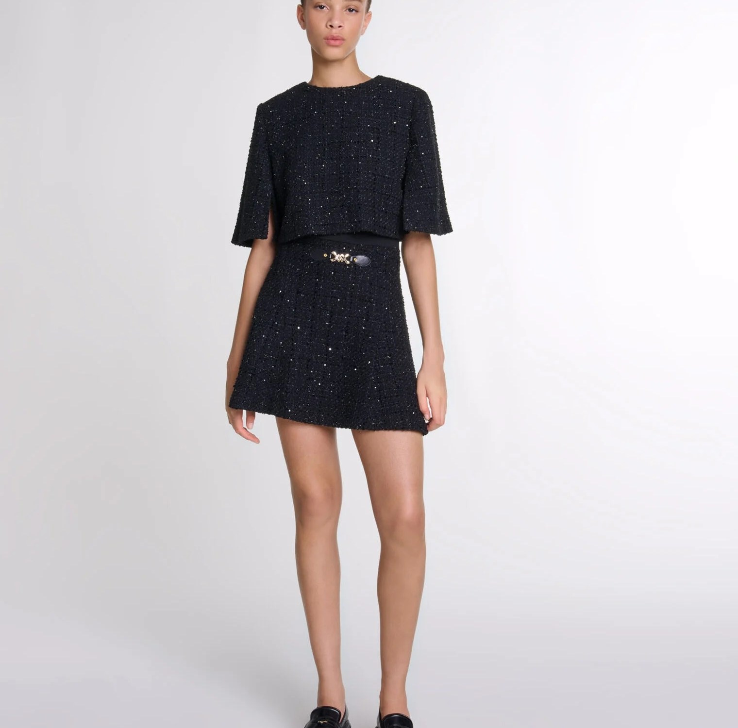 Brighten up your seasonal look with this 2-in-2 ensemble in shiny tweed. It consists of a short dress with a dual-material vest and a flared skirt with a curb chain buckle. Wear it on its own for a sophisticated look or layer it with the short-sleeved, round-neck top, subtly embellished with a button-up slit at the back.