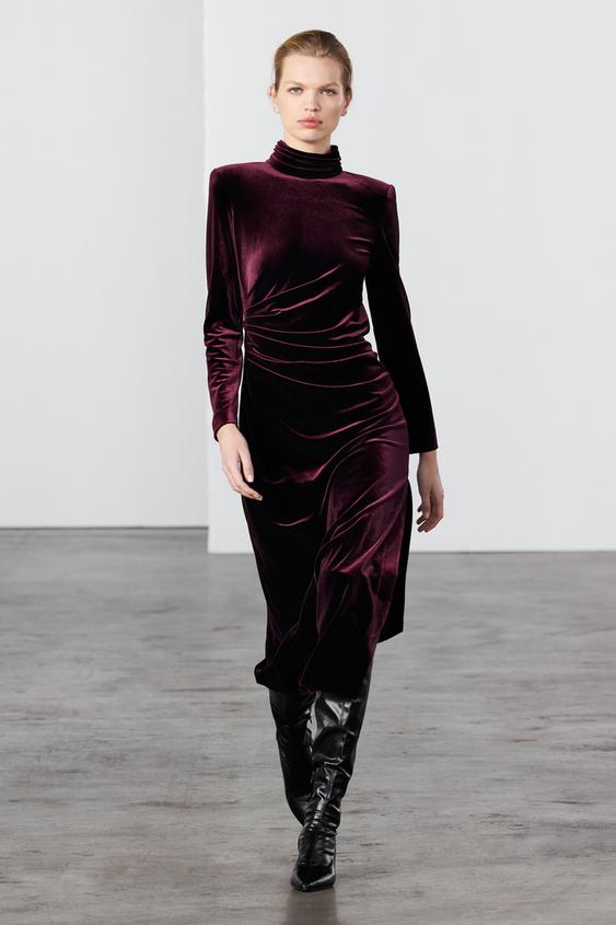 Long dress made of velvet. Perkins collar and long sleeves. Draped fabric detail and cut-out at back. Concealed in-seam zip fastening.