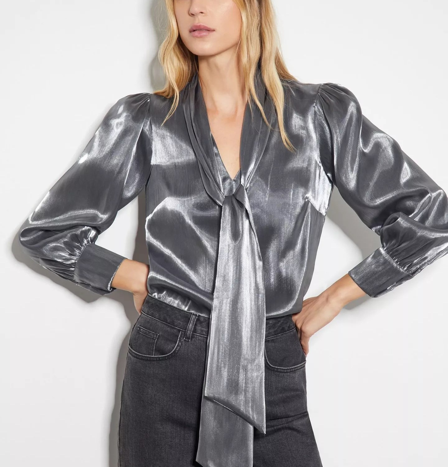 Showcasing an elegant organza fabric with a mesmerising liquid silver sheen, this blouse will have heads turning as you walk down the street (or into the office). Finished with a pussybow neckline to style in whatever way you wish.
