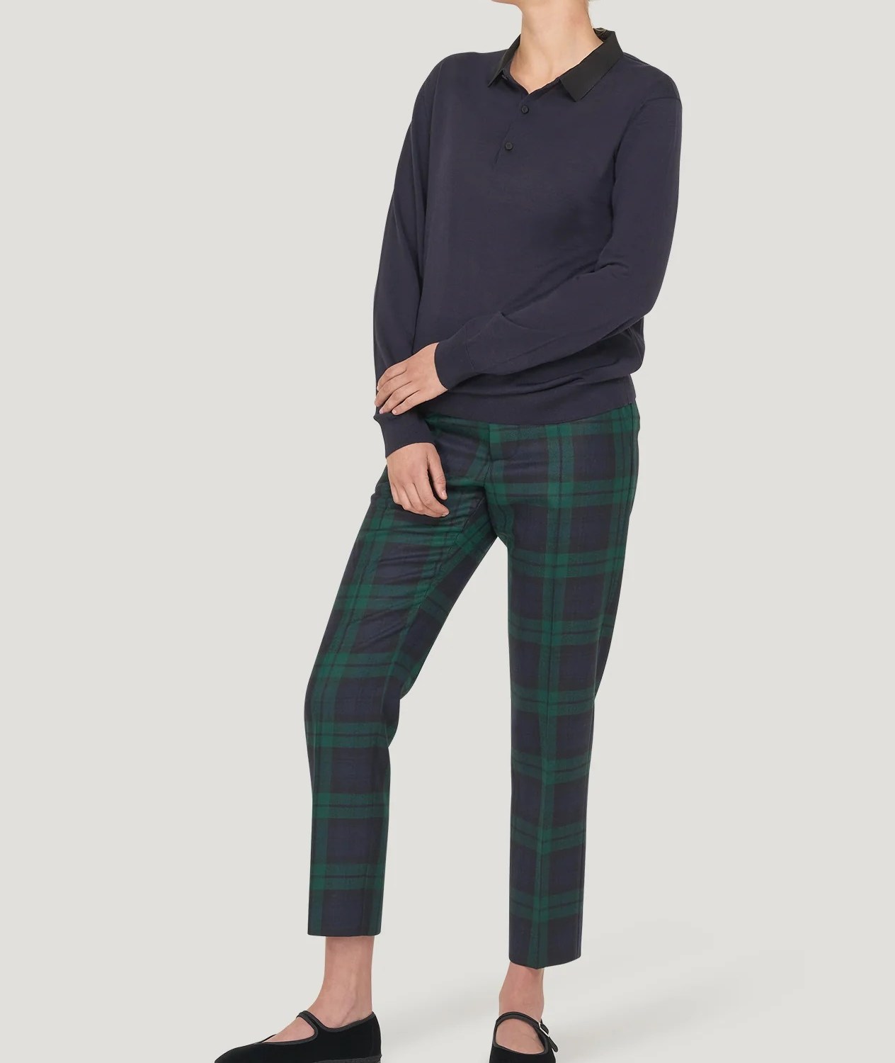 The Tartan Trews are a play on traditional Scottish trews in a Black Watch fabric. The trousers have a classic waist and a slim leg fit and a relaxed button fly front. Slightly longer in the rise for a modern edge, these wool check trousers have adjustable tabs at the waistband and dark horn Connolly buttons. The trousers have side pockets and a single back jet pocket with button. The higher waist band lends itself to working with a dinner jacket for an evening look.