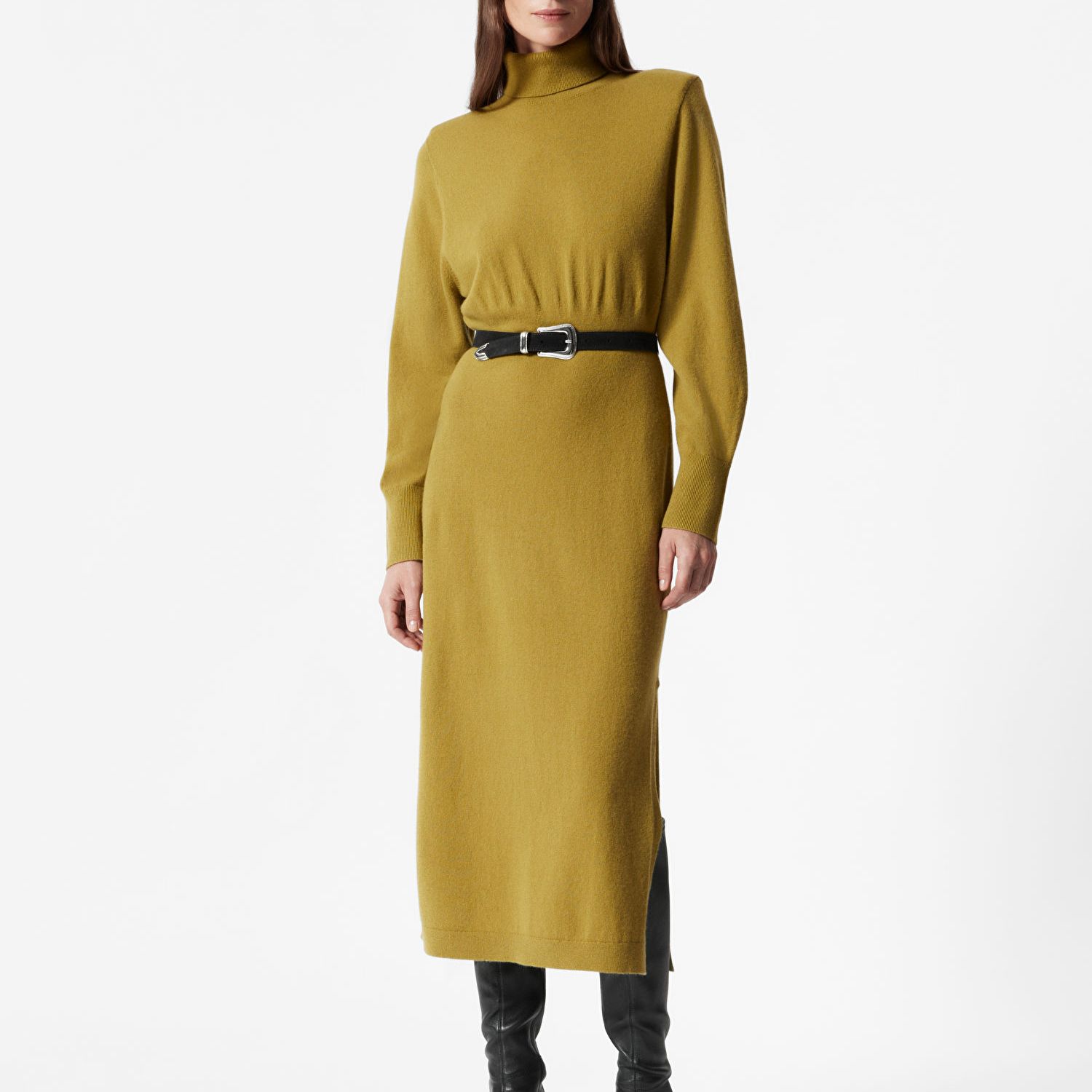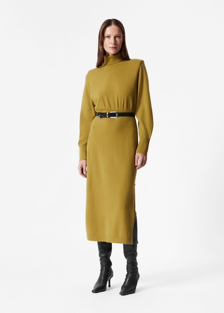 Turtleneck wool knit midi dress featuring padded shoulders, a fitted waistline and a high slit.• Slim fit• Shoulder pads• Certified according to the Responsible Wool.
