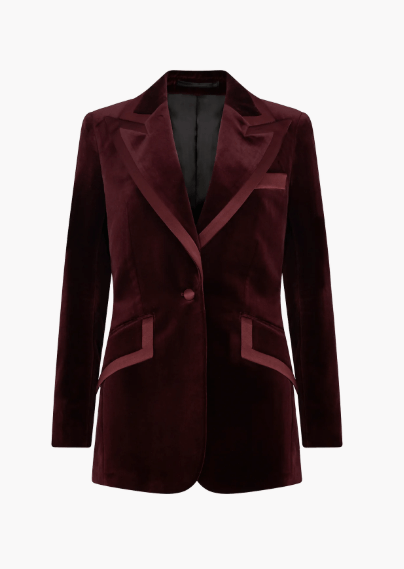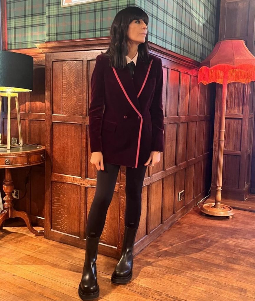 Claudia wore a Knatchbull Maroon Velvet Tuxedo with Maroon Silk Edge Tape (sold out), for The Traitors on Wednesday 8th January 2025. Claudia was styled by Sinead McKeefry.