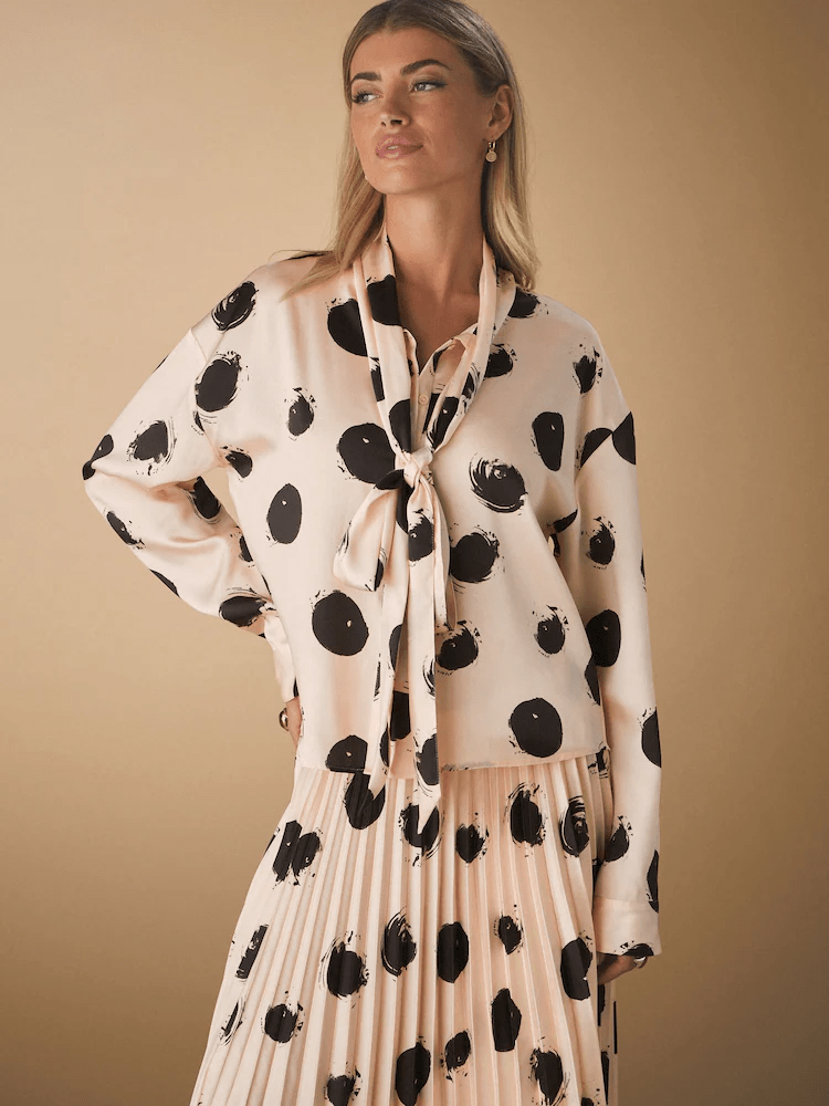 This gorgeous ecru spot print blouse is made from a lightweight fabric with tie neck detailing, featuring a drape effect that lends itself to casual or smart looks. Matching skirt sold separately.